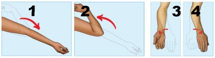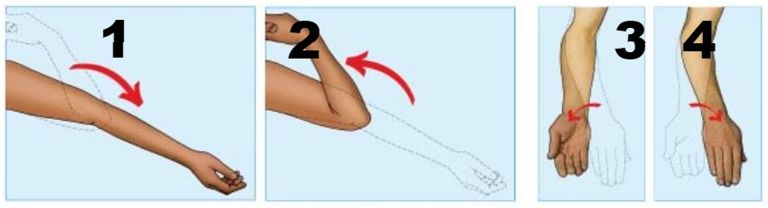 Il movimento completo viene misurato dall’estensione completa (0 gradi FIG 1) fino ad una flessione massima (140 gradi FIG 2), quando l’avambraccio si piega completamente sul braccio, e la mano tocca la spalla; allo stesso modo si valuta la prono-supinazione della mano con il palmo rivolto verso il soffitto (supinazione di 90 gradi FIG 3) o verso il pavimento (pronazione 90 gradi FIG 4).